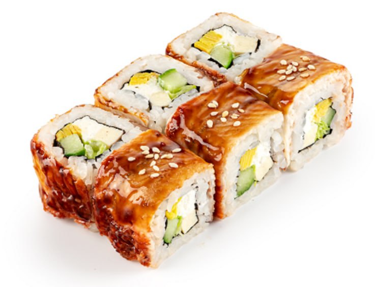 Угорь, сливочный сыр, огурцы, омлет, тофу, соус унаги, кунжут