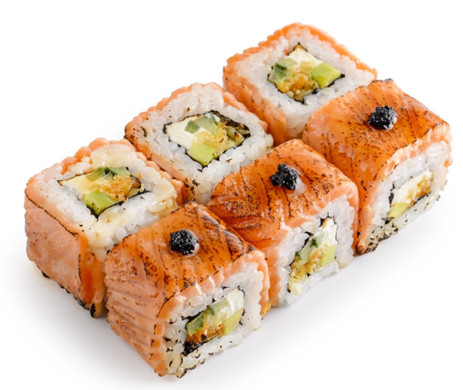 Лосось, сливочный сыр, соус Спайси, огурец, авокадо, темпура, соус Терияки, тобико, кунжут, рис, васаби, нори