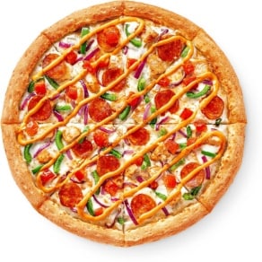 Цыпленок, острая чоризо, сладкий перец, красный лук, томаты, моцарелла
